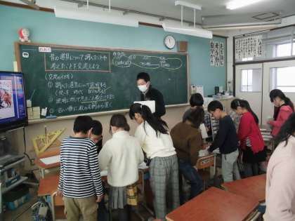 3年生は社会科で昔の道具について学びました。どのように便利になってきているかをみんなで相談をしながら,道具の年代順並べ替えをしました。