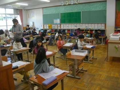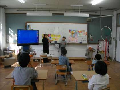 3組では,紹介コーナーで発表をしていました。1年生はまとめのテストプリントに取り組んでいます。