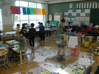1年生は算数の学習を進めています。今日はおはじきを使って点数を数えています。2年生は,紙版画の作品制作に取り組んでいます。