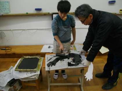 3組では,大きな紙版画に取り組んでいます。