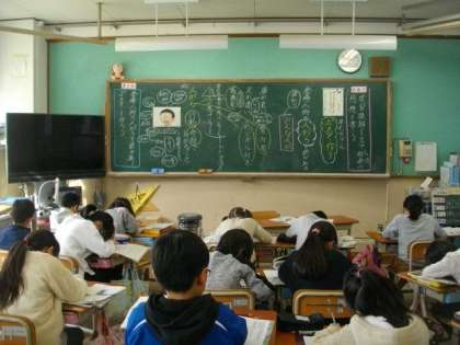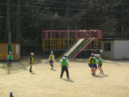 3年生は国語の学習です。4年生は運動場でサッカーをしていました。