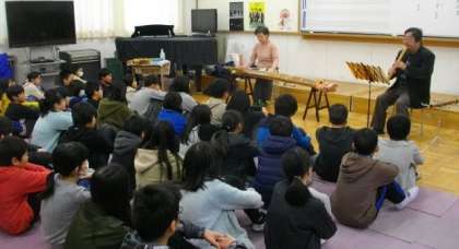 5年生は音楽鑑賞をしています。本校では,今日は,地域の方をお招きし,琴と尺八の演奏を聞かせていただきました。最初は「春の海」の演奏です。CDで聞いたことがあるけれど,本物の楽器を前に聞くのははじめての子どもたちが多かったようです。じっくりと聞き入っていました。