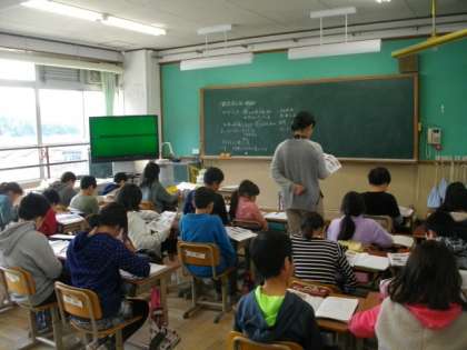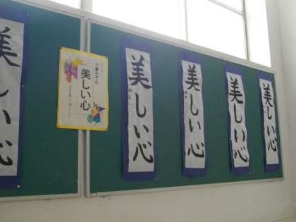 4年生の学習の様子です。階段の掲示板には,力強い習字の作品を掲示しています。