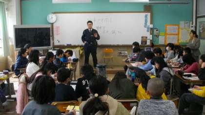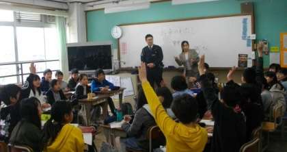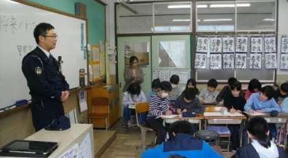 今日は,静市交番で勤務をされている警察官をお招きし,どのような思いでお仕事に携わっておられるのか等についてお話をしていただきました。子どもたちからは次々と質問や感想が出ていました。