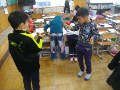 1年生は,生活科でけん玉やコマ回しに挑戦していました。