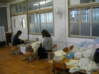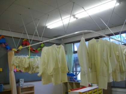 給食エプロンの洗濯をしたあと,アイロンをあてています。