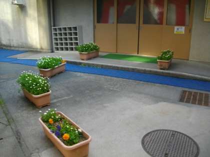 通路には,子どもたちが育ててくれた花を設置しました。