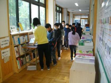 新しい教科書を配るために,協力して運んでいます。教室にかえって,ていねいに名前を書いています。