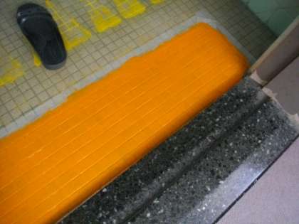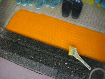 1年生教室の横にあるトイレの「スリッパ置場」のペンキを塗りなおしました。