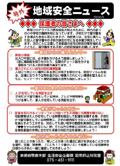 京都府内の多くの小中学校が臨時休校となっております。子どもだけで留守番をする場合もあると思われますが,他府県では,住宅に侵入した犯人と留守番中の子どもが鉢合せになる事案が発生しているとのことです。プリントを参考にして防犯対策について改めてご留意ください。(参考までに右欄 「お知らせ等」欄に「防犯対策について」を掲載しております。 )