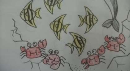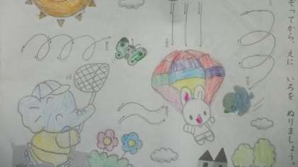 このプリントは,1年生のお友達のものです。とてもていねいに取り組んでいますね。表紙の絵にも色を塗ってくれました。すてきですね。