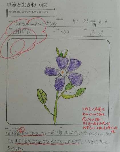 「絵の具でゆめもよう」の作品と「季節と生き物」の観察カードです。