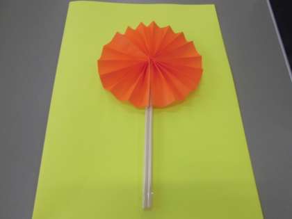 まず,3まいの色紙と2本の割りばしを使って,まるく開くおうぎをつくってみましょう。教科書P.11につくり方がのっています。出来上がりは,1まい目(一番上)の写真のようになります。