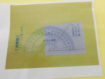 2まい目(真ん中)の写真を見てください。おうぎを開いていろいろな大きさの角を作ってみましょう。角は,直線(わりばし)がどれだけ回ったかで角の大きさが決まります。角の大きさをはかるには,分度器を使います。教科書のうしろに分度器があります。