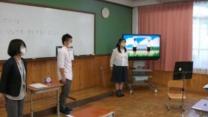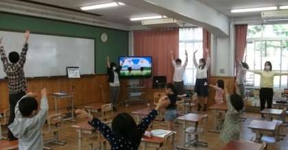 今日は,1年生のお部屋で「Zoomでラジオたいそう」を行いました。初めての取り組みでしたが,たくさんのお友達が参加をしてくれました。ラジオ体操をしたあと,じゃんけんやクイズにも挑戦しました。特例預りで学校にきているお友達も,いっしょに取り組みました。
