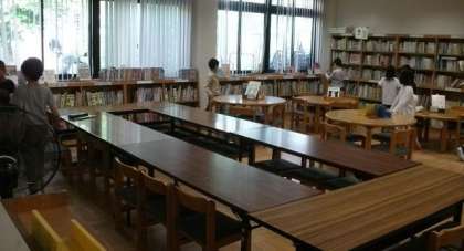 運動場では,間をあけてなわとびに取り組んでいます。図書室は席と席との間をあけるためにレイアウトを変えました。
