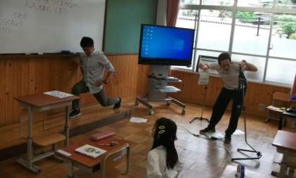 みんなでラジオ体操をしたあと,今日はストレッチをしました。体は,ぐんと伸びましたか?(教室で参加をしている先生方の方から,イテテ…をいう声が聞こえてきましたが…)