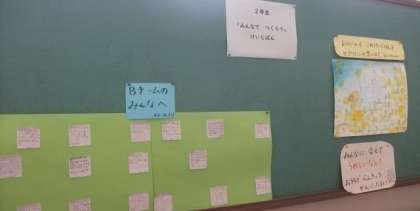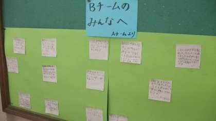 2年生が,Aチームさんへ,Bチームさんへとお手紙を書いて貼っています。