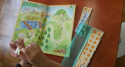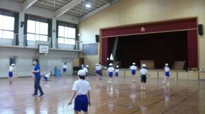 4年生は,体育館でなわとびに挑戦しています。1年生は数図ブロックを使って,挿絵の数とブロックの数を対応させています。