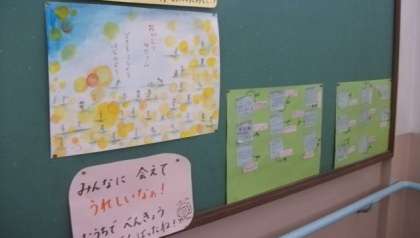 2年生の掲示板には,A班とB班のお友達のメッセージが貼ってあります。