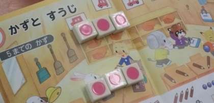 1年生は,算数の学習を進めています。図に示された数と,数図ブロックの数とを合わせています。(なお,指導にあたる教員は,授業中に一般的なマスクのほかに,飛沫防止のための透明マスクやシールドを着用しているときもあります。)