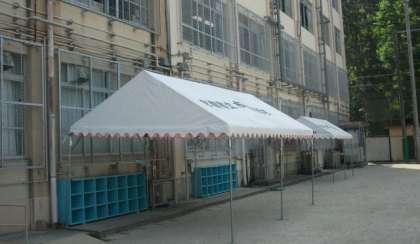 暑くなってきましたので,熱中症に気を付けなければなりません。今日は,運動場に少しでも日蔭ができるようにとテントを張りました。校舎入口付近に,簡易ミストを設置しました。