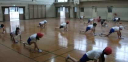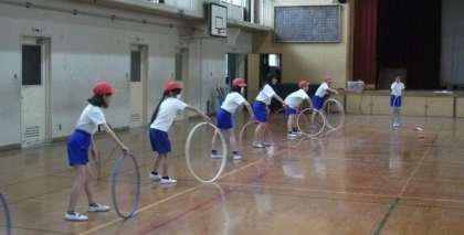 6年生は,体育の学習をしています。ストレッチをした後,フラフープを使い,体を動かしています。バランス感覚をやしなったり,平衡感覚をやしなったりと,いろいろな体の動きに挑戦しています。(なお,個人で使っているフラフープは,学習前後に消毒を進めるとともに,学習後の手洗いにも取り組んでいます。)
