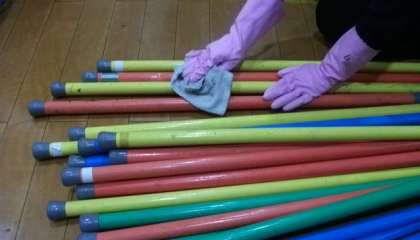 子どもたちが下校した後,教職員総出でクリーンタイムの時間となります。手すりやドアノブ,電気のスイッチ,扉の入口などを消毒していきます。体育で使用したポールも1本1本消毒をして明日に備えます。