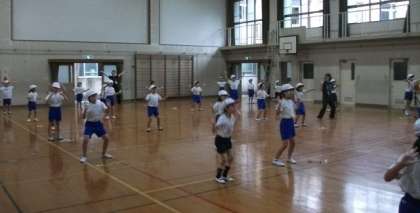 体育館で,パプリカをみんなで元気よく踊っています。