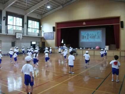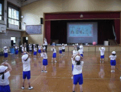 体育館で,音楽に合わせて元気いっぱいに体操をしています。