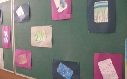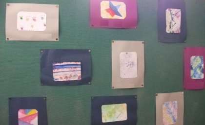 5年生の作品です。(階段の踊り場にある掲示板に掲示しています。)