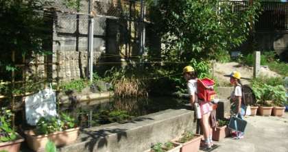 毎朝,池の中をのぞきこんで,泳いでいる金魚などをみているお友達もいます。