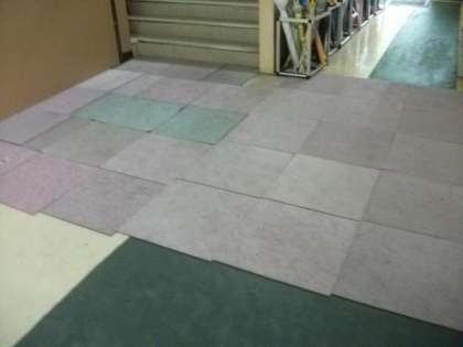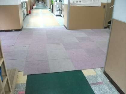校舎の1階が,雨と湿気で大変すべりやすくなってきました。そこで,少しでもすべりにくくなるように,急遽,ミニカーペットを敷き詰めました。