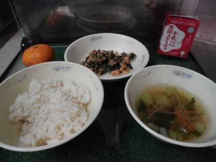 肉みそいためには,大豆・豚肉・こんにゃく・にんじん・しいたけ・ほうれん草が入っています。食べやすいように,それぞれの具は大豆と同じくらいの大きさに切っています。