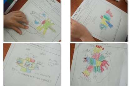 3年生図画工作科「カラフルフレンド」のデッサンです。ストーリーを考えながら,かきたしています。