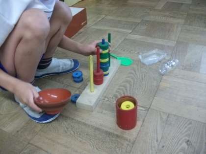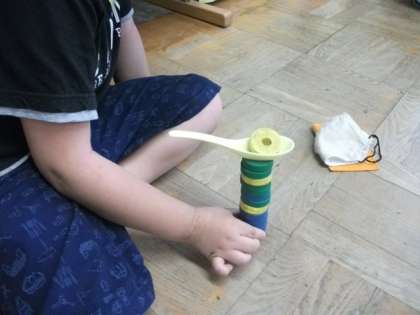 ゆっくりしんちょうに積み上げないと,最後のスプーンは落ちてしまいます。そーっと積み上げていました。
