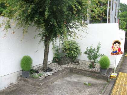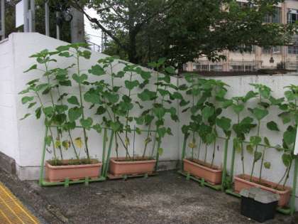 ひまわりが大きく育ちました。背丈は塀の高さを超えました。まもなく花が咲くことでしょう。