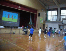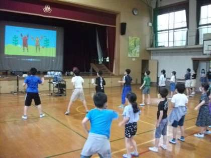 昼休みのダンスタイムです。前方では5年生がのびのびと体を動かしています。