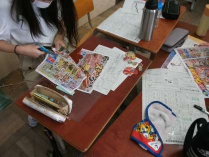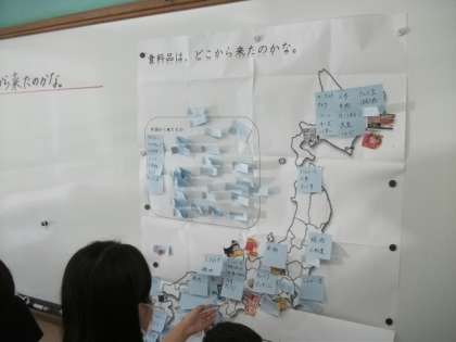 広告でみつけた商品の写真を切取り,産地ごとに日本地図にはりつけていきます。