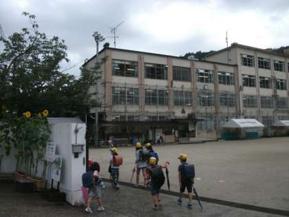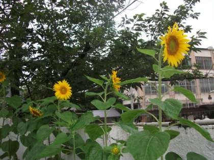 校門前に植えているひまわりは,背丈が2mを超えました。