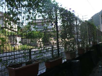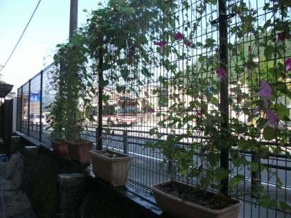 鞍馬街道沿いの緑のカーテンには,琉球朝顔を植えていました。暑い日が続きましたが,こまめに水やりをしていたので,ぐんぐんのびています。
