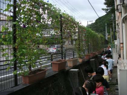 鞍馬街道沿いに育てていた緑のカーテンがあります。朝顔の花をとりに行きました。