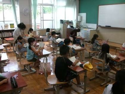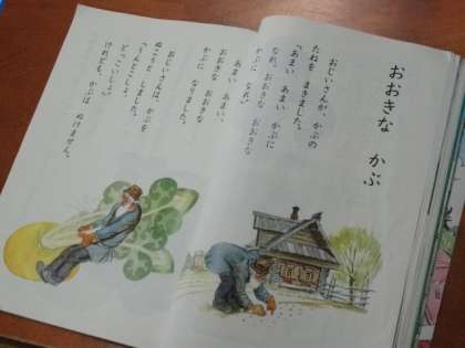 1年生は,国語で「おおきなかぶ」を読み進めています。はじめに,音読をしていました。