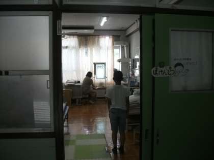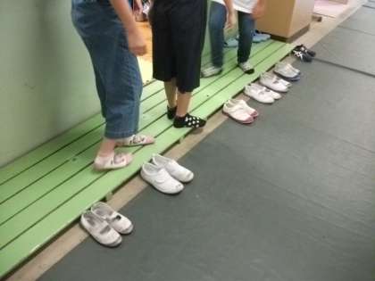 視力検査の時間です。昨年は,全員が保健室に入って,目の健康に関するお話を聞いてから行っていました。本年度は小グループに分かれて入室し,順次検査を行っています。入室するときに,きちんとはきものをそろえる習慣がついているのは,とてもすてきなことだと思います。
