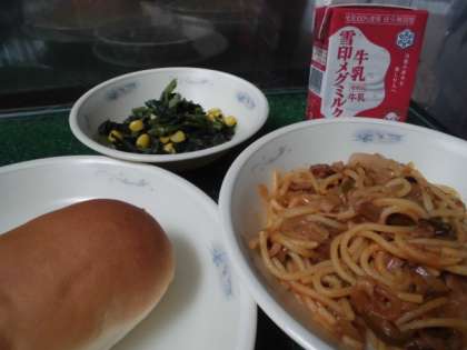 今日の「イタリアンスパゲティ」の具には,夏野菜のズッキーニ,ピーマン,たまねぎ,ベーコンを使っています。夏野菜には水分が多く含まれているので,体温を下げるはたらきがあります。