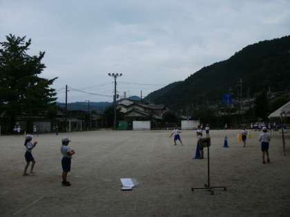 2年生の体育の様子です。「投げる」動作の練習をしています。