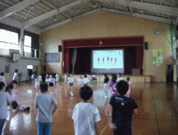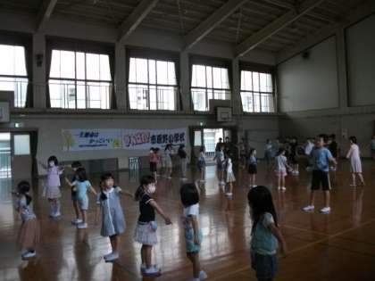 中間休みのダンスタイムです。「風になる」は,すでに覚えているお友達がたくさんいて,後ろを向いて踊っています。