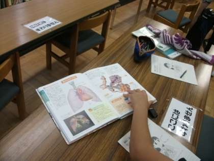 6年生は,理科で体のつくりについて調べています。コンピュータでは検索キーワードをもとに,図書室では図鑑や図表を中心にして調べています。