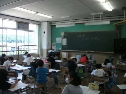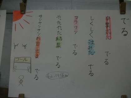 4年生はお話の絵に取り組んでいました。教室には,言葉遊びの要素を取り入れた詩が掲示してあります。