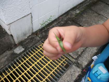 校門前で急にしゃがみこんだ子がいました。どうしたのかなと近寄ると,かわいらしいショウリョウバッタを手にしていました。